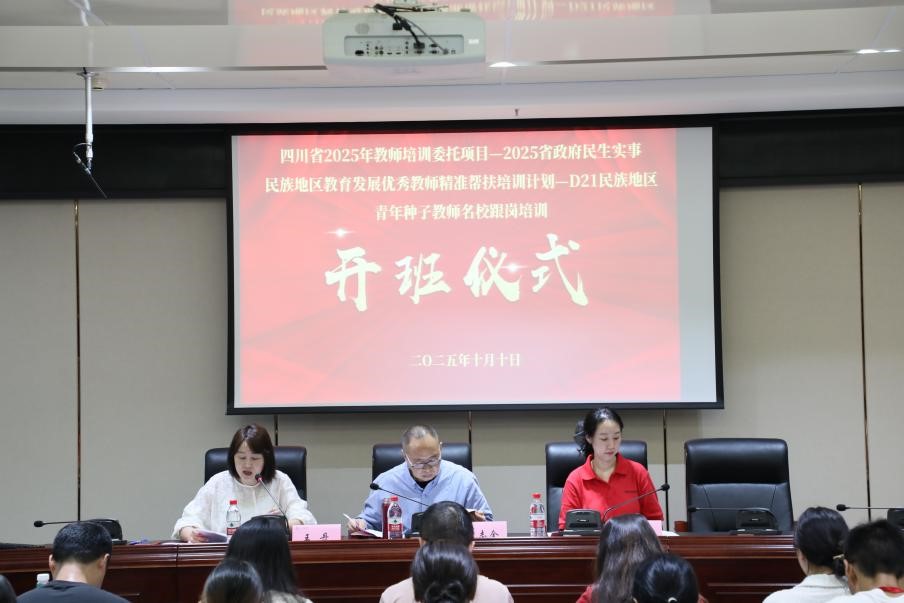 2025年10月10日上午8:30,由四川师范大学承担的2025年教师培训委托项目——省政府民生实事—民族地区教育发展优秀教师精准帮扶培训计划—青年种子教师名校跟岗培训,在四川师范大学狮子山校区明德楼三楼干训室二正式开班。50名来自阿坝州的中小学教师齐聚现场,将通过为期20天的集中研修,夯实专业能力,为民族地区教育提质蓄力。四川师范大学教师培训学院原院长李志全、四川省教育厅四川师范大学基础教育课程研究中心副主任、博士生导师、培训首席专家王亚军,及培训班主任团队(四川师范大学教育培训部王丹、黄松、王虹)出席仪式,开班式由王丹主持。