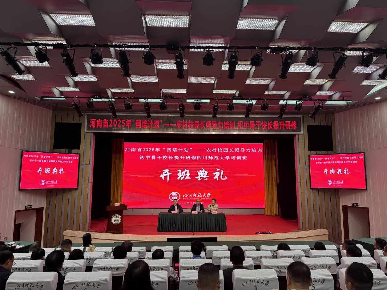 2025 年 10 月 14 日上午,由河南省教育厅主办、四川师范大学承办的河南省 2025 年 “国培计划”—— 农村校园长领导力培训初中骨干校长提升研修项目开班典礼,在四川师范大学狮子山校区学术厅隆重举行。此次研修聚焦河南省农村初中教育发展难点、痛点和堵点,旨在通过系统的理论指导与实践赋能,帮助骨干校长提升领导力水平,以适配新时代义务教育优质均衡发展要求,进而推动农村初中教育教学质量整体提升,为河南省义务教育均衡优质发展注入新动能。